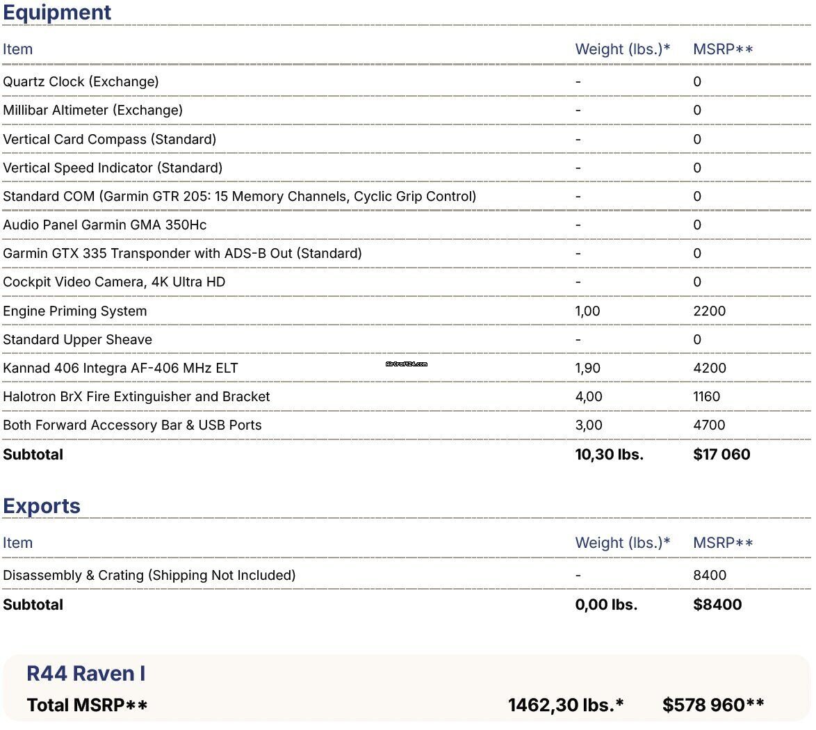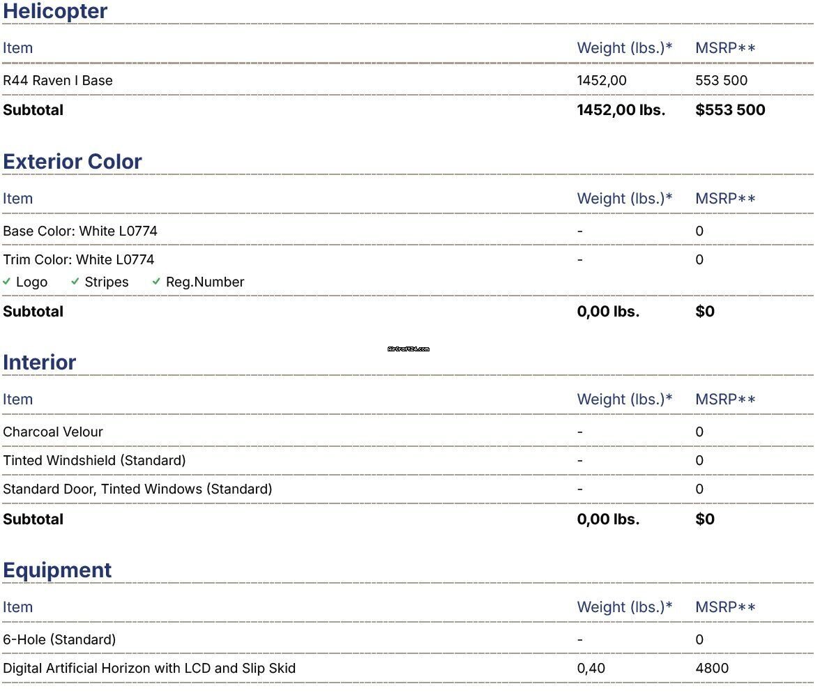 | Description | | Type: | Hélicoptère (Piston) | | Marque: | Robinson | | Modèle: | R44 | | Millésime: | 2023 | | Immatriculation: | SP-SOW | | Numéro de série: | 2766 | | Emplacement: | Pologne | | Heures totales cellule (TTAF): | 1700 h | | Prix: | US$ 360.000 (~ € 308.114) | | Détails |