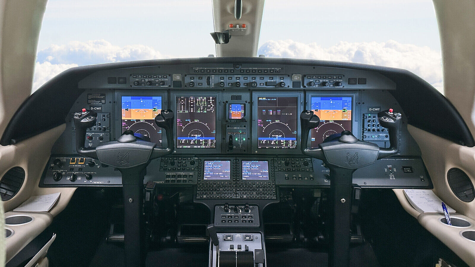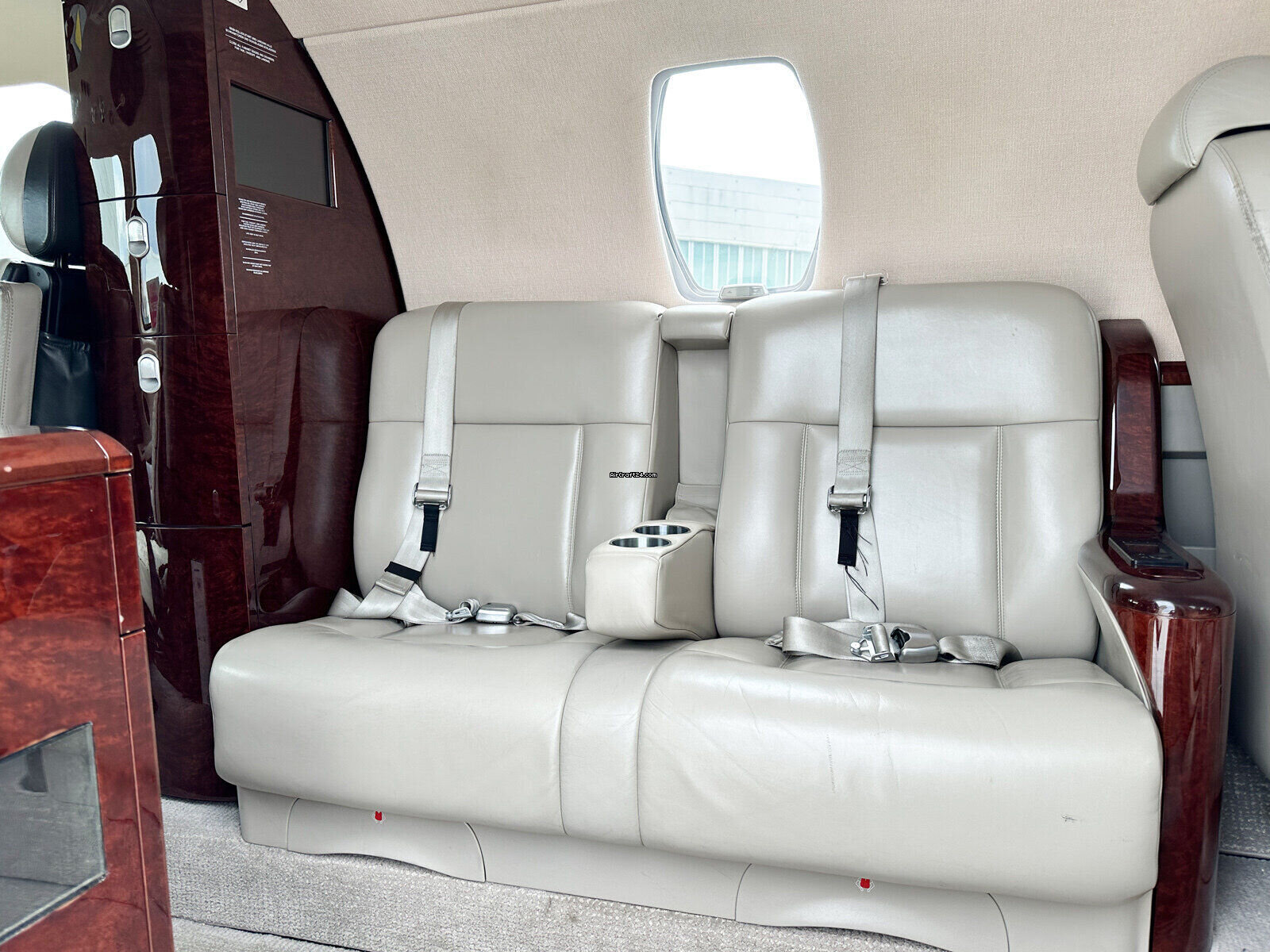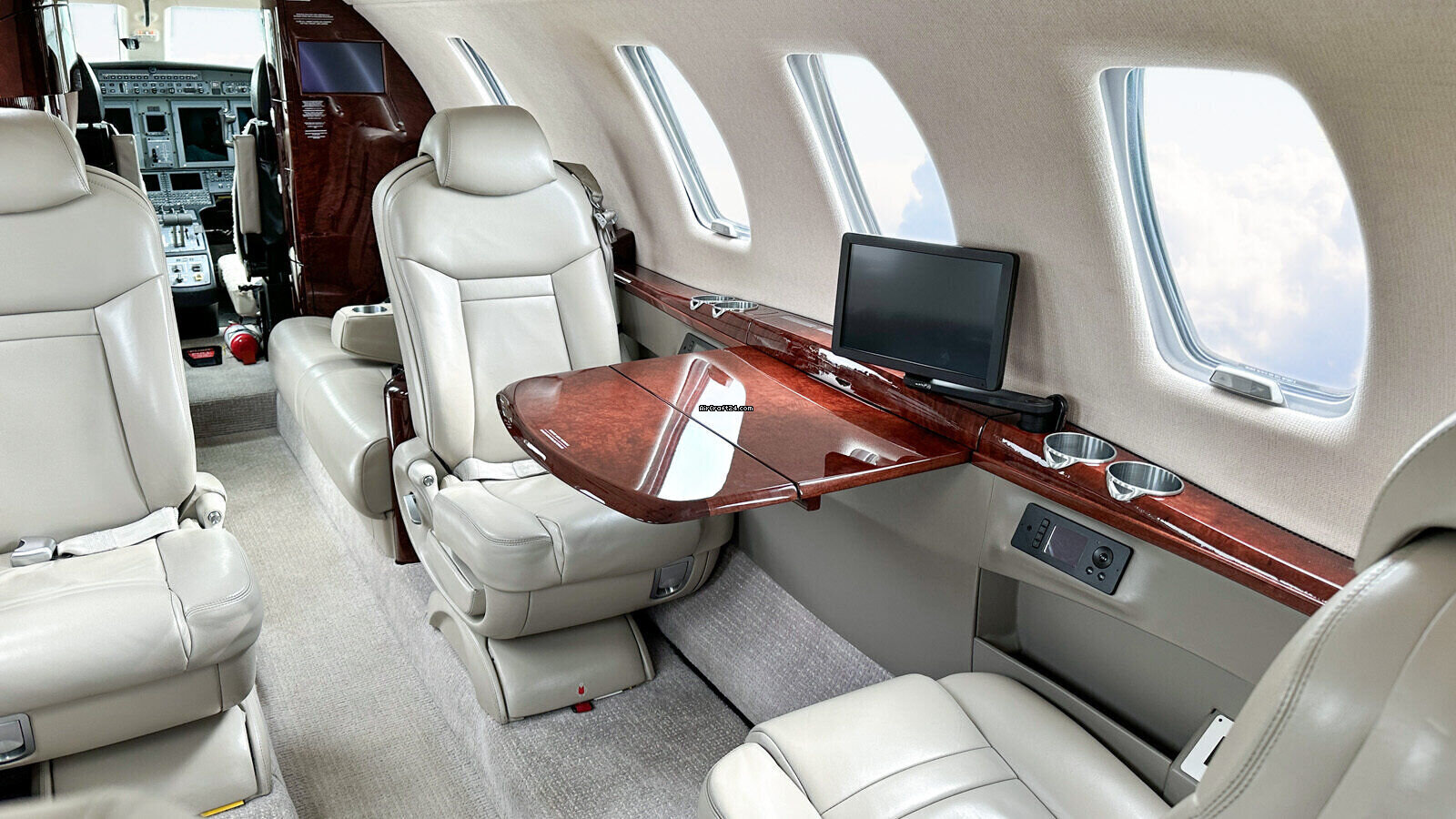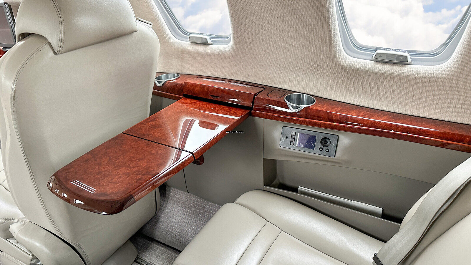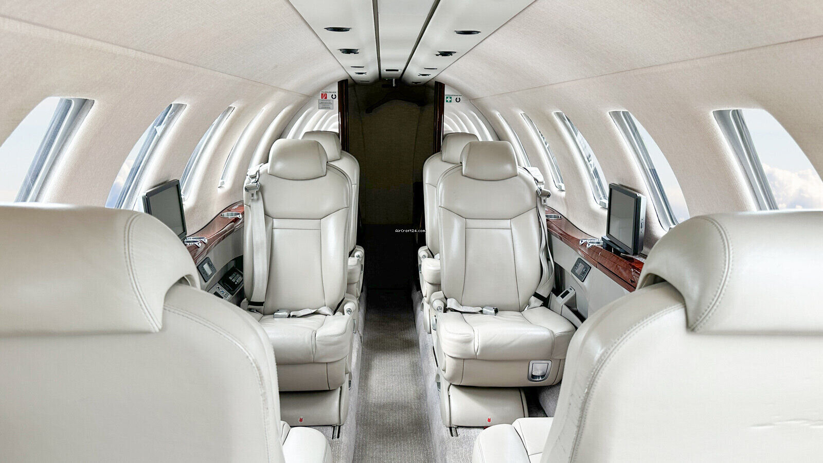 | Intérieur | | 2 Crew-, 4 Club Seats; 2 single fwd. Seats, double seat Divan (Couch) and belted Toilet Seat (max. 9 Pax), AC Power Outlets, Lavatory with sliding door for privacy, 2 additional foldable slimline Tables on seat 7 & 8, Satcom Telephone, Airshow with Media Center and 2 additional Table Screens, Hot Coffee Bar, electric Window shades. |