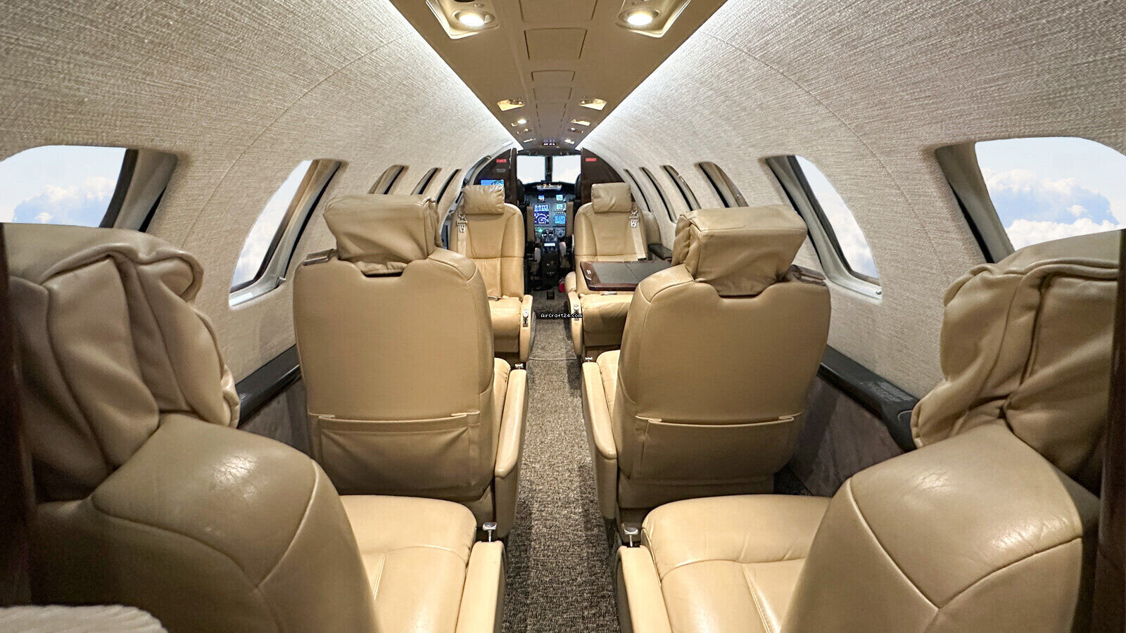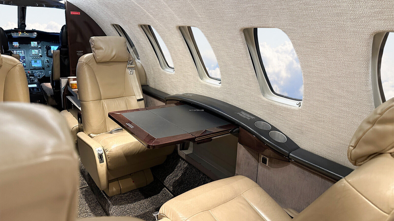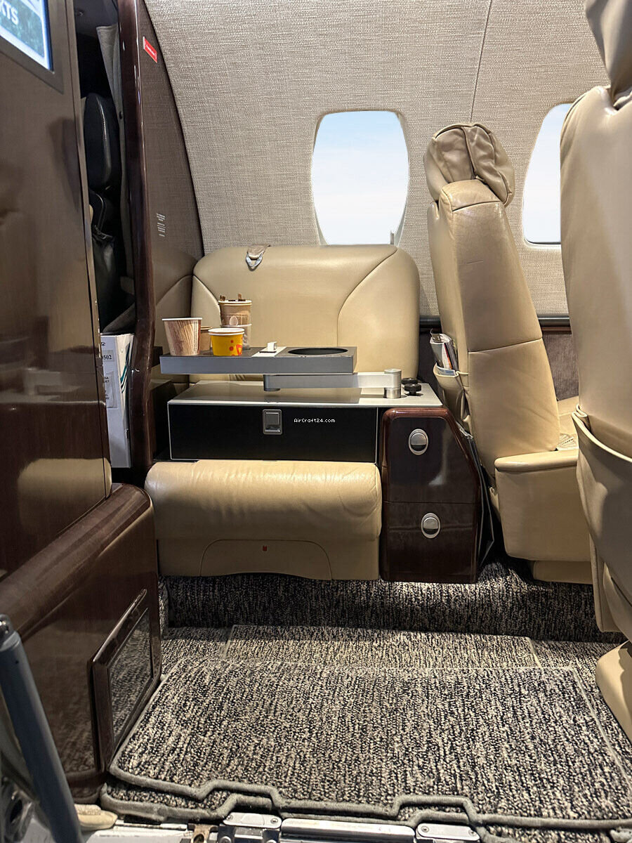 | Intérieur | | Six (6) passenger executive seating in beige leather (four club seating, two single fwd. facing seats), one side facing seat (7) plus belted lav seat (8), brown carpet, brown wood veneer (gloss laminate), lavatory separated by a sliding door for privacy, slim refreshment center (hot Cup), brushed aluminum hardware, Cabin information Display (AvVisor Plus), 110 V AC Cabin and Cockpit power outlets |